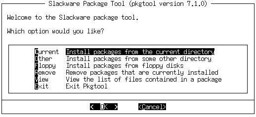 pkgtool(8) is a menu-driven program that allows installation and removal of packages. The main menu looks like this: